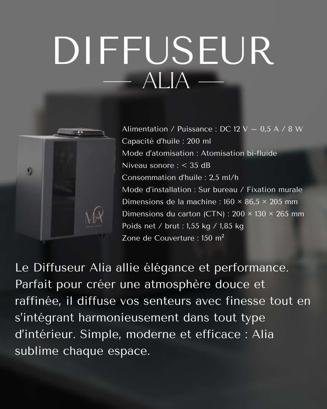 Au bureau ou à la maison, le diffuseur Alia apporte une touche de calme et de concentration jusqu’à 200m2 de superficie.