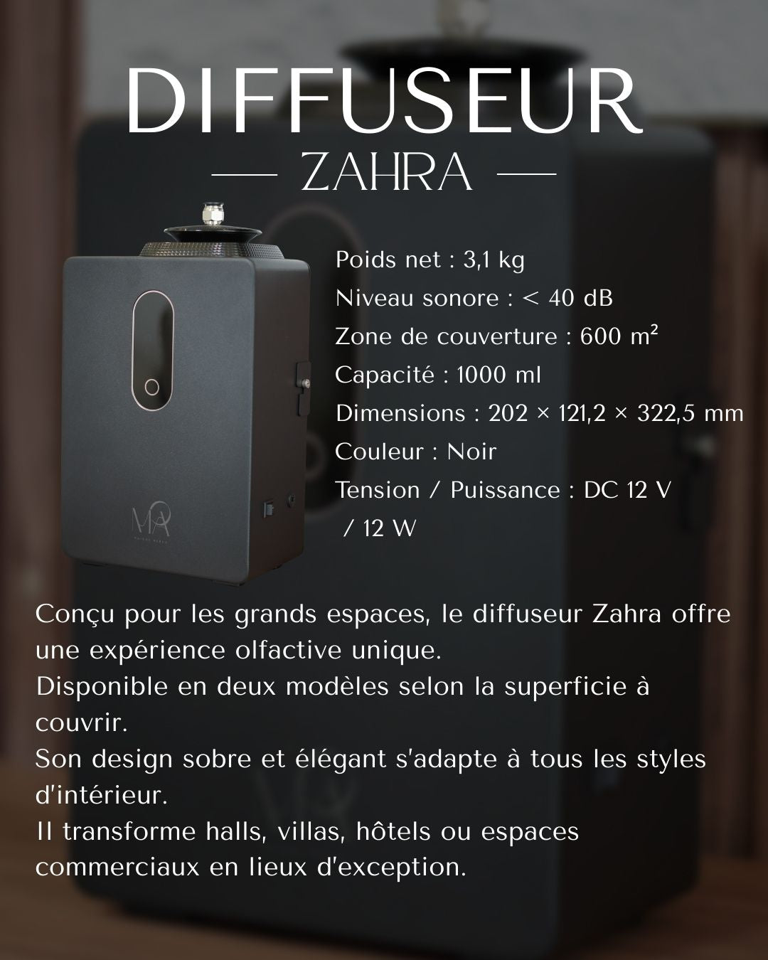 Conçu pour les grands espaces, le diffuseur Zahra offre une expérience olfactive hors du commun. Comme le Naya, il se décline en deux modèles selon la superficie à couvrir.